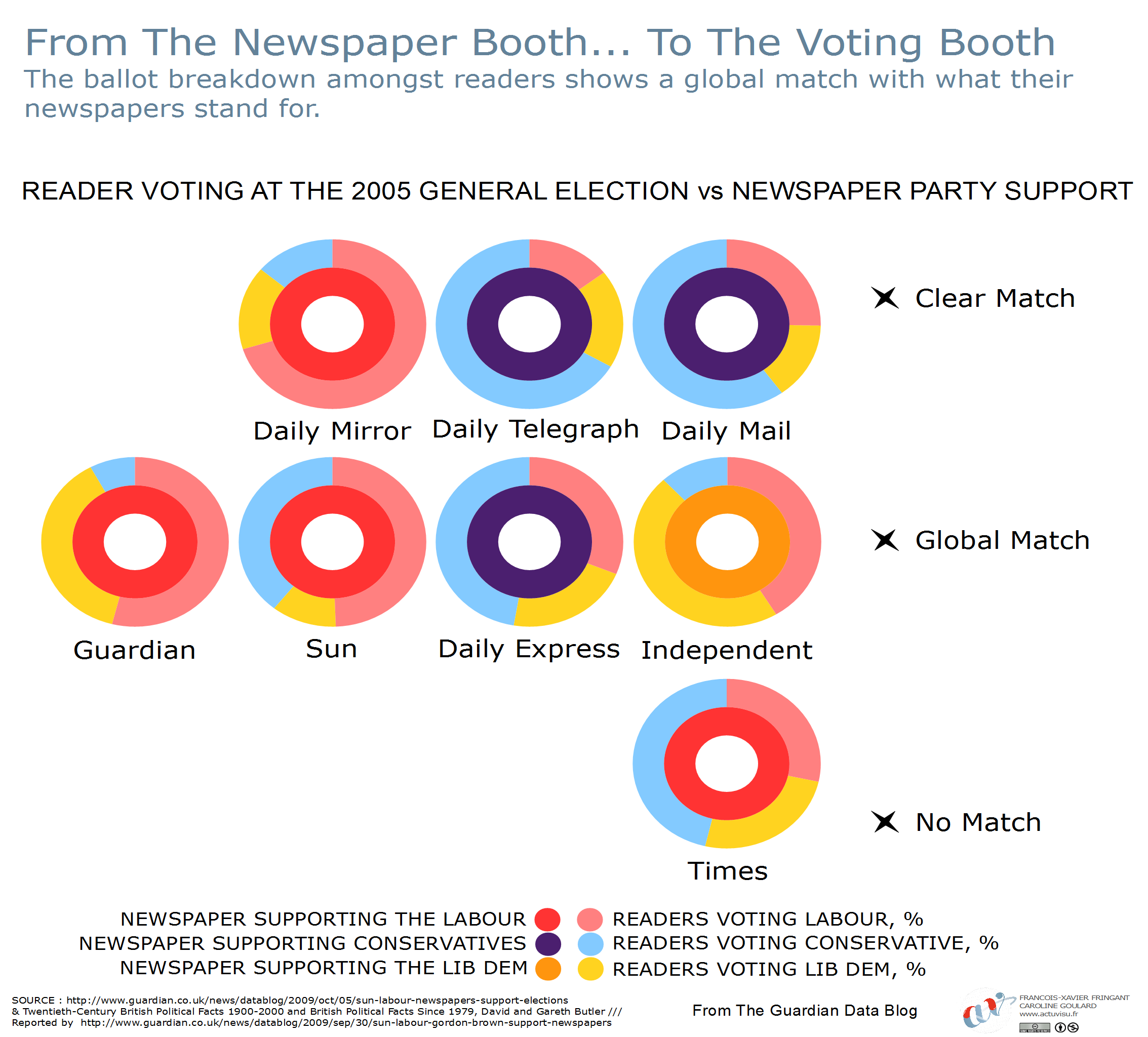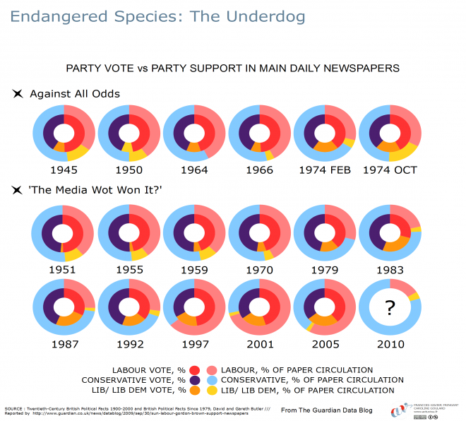 Alors, les magnats des médias ont-ils réellement une influence sur le vote populaire ? Un journal peut-il modifier le cours d’une élection de manière significative ? Ou bien ne fait-il que suivre les opinions de ses lecteurs ? Cette question reste au centre de la compréhension de la politique et elle requiert une analyse profonde que ces visualisations ne prétendent pas atteindre. Nous avons simplement essayé de mettre côte à côte les quotidiens et les partis qu’ils ont soutenus.