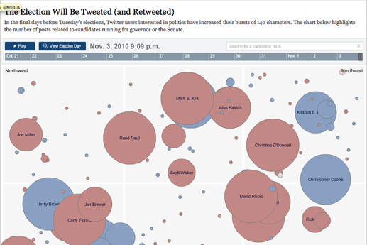 Outre cette approche plutôt théorique, les chiffres et les différentes actions parlent d’eux-mêmes. Aux États-Unis toujours, le 3ème débat télévisé en 2010 a généré 154.342 tweets relatifs à différents termes proches du débat sur Twitter, soit près de 27 tweets par seconde, par 33.095 individus, selon le compte Twitter officiel @Tweetminster. Sur Facebook, des groupes pro-Républicains ont rassemblé jusqu’à 136.000 personnes, jusqu’à 126.000 pour les pro-Démocrates. The Washington Post a acheté la tendance de recherche promotionnelle « #Elections », le New York Times a créé une cartographie [en] affichant le tracking des discussions au sujet des différents prétendants, Twitter a appelé à l’utilisation des hashtags #Votereport et #NYCvotes, Foursquare a créé le badge « I voted », une application Facebook a été spécialement conçue afin d’appeler les plus réticents à voter et Facebook a appelé au vote et proposé un outil de localisation du bureau de vote le plus proche de chez soi.