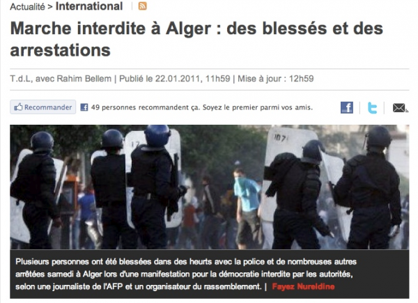 Pour le Parisien.fr, la manifestation d’Alger se présente dans le registre iconographique des émeutes. Le dispositif est le même que celui souvent utilisé par la presse française pour illustrer les flambées de violences urbaines en France. L’image est prise de derrière le cordon de policiers, protégeant ainsi le spectateur de la menace que représente la jeunesse en colère. Il se trouve placé par le cadrage dans la position de celui qui est visé par les projectiles et qui se rassure de la protection de la police.