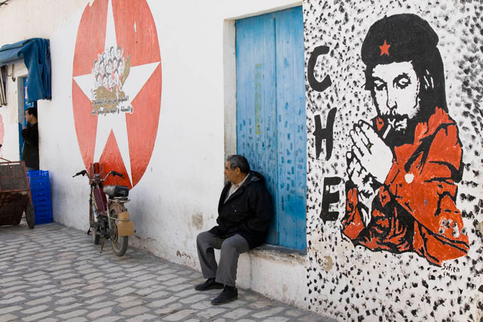 Cependant, l’absence de femme est compensée par la présence d’une citation du Ché qu’on reconnaît facilement au centre de l’image, par la couleur rouge du drapeau Tunisien (double référence à la Révolution) et par ces poings levés qui revendiquent plus qu’ils ne menacent…