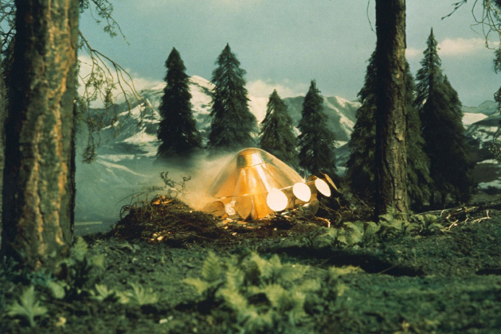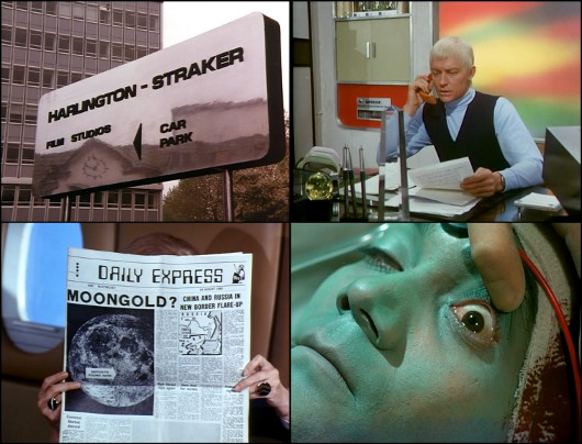 Dans UFO, la terre de 1980 doit se défendre contre une menace extra-terrestre : des vaisseaux spatiaux inamicaux visitent régulièrement la planète bleue et n’hésitent pas à détruire les centres de recherches dont les découvertes pourraient menacer leurs plans, ou à tuer des humains pour leur voler des organes, dans le but probable d’adapter leurs propres organismes aux conditions de vie terrestre. L’existence des extra-terrestres et leur hostilité sont cachés au public, c’est pourquoi le SHADO (Supreme Headquarters, Aliens Defence Organisation), organisation secrète de défense de la terre, a son quartier général dans un studio de cinéma et est dirigé par Edward Straker, un ancien militaire américain qui se fait passer pour un producteur de cinéma. Lorsqu’il appuie sur un bouton, son bureau apparemment normal s’enfonce sous terre où il peut rejoindre son équipe. Jolie mise en abyme : des producteurs de films de science-fiction racontent l’histoire d’une organisation future qui combat des extra-terrestres sous le masque de la production cinématographique. Dans le second épisode de la série, le studio Harlington-Straker emploie même son expertise en effets spéciaux non pour fabriquer de la fiction, mais pour supprimer toute preuve de l’existence d’une menace extra-terrestre sur des films et des photographies réalisés par deux pilotes d’essai.