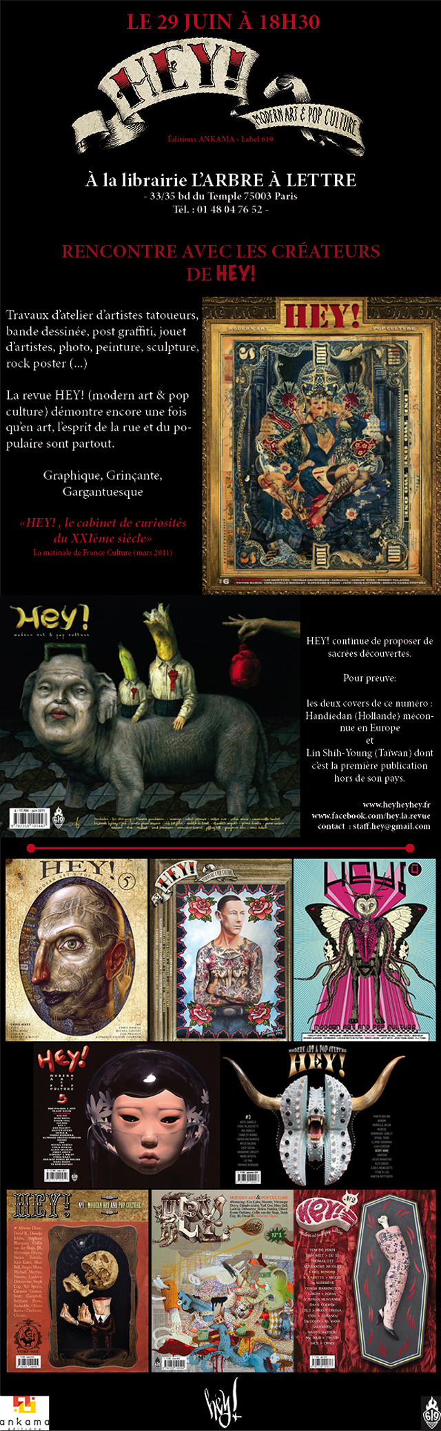 Machin bizarre de l’actualité en ligne, OWNI est aussi esthète. Sensibilité à la beauté, augmentée, c’est tout naturellement que la Soucoupe s’est mise en approche d’une autre entité bizarroïde et sublime: la revue d’art HEY!. Anne et Julien, les doux rêveurs un peu jetés à l’origine du projet se sont lancés dans le grand bain en mars 2010, avec la publication d’un premier opus. Cinq ont suivi; le sixième vient d’atterrir dans les librairies.