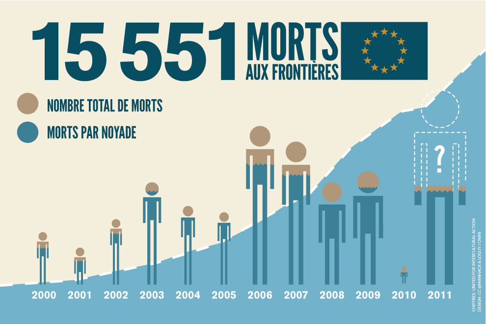 De janvier à juin, entre 1500 et 1800 migrants au moins sont morts en tentant de venir se réfugier en Europe, laissant augurer que l’année 2011 sera la plus mortelle pour les réfugiés. En 2006, 2000 morts avaient été recensés, pour toute l’année, et 1785 en 2007. Toutes les autres années, le nombre de morts répertoriés étaient inférieurs à 1500.