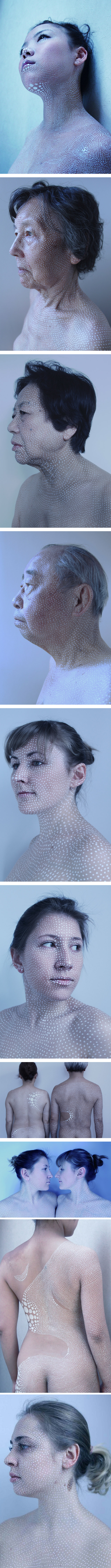 Cette semaine, j’ai également eu le plaisir de découvrir le travail minimaliste mais très envoûtant de Miharu Matsunaga. Cette jeune artiste, designer & photographe japonaise est née en 1989 à Yokohama. Elle a ensuite étudié le design graphique à la Tama Art University pour ensuite travailler dans une agence de publicité à Tokyo. Pour son projet de diplôme, elle a réalisé cette superbe série de portraits où des milliers de points sont peints à la main sur les modèles qui posent. Je vous laisse découvrir ce travail contemplatif, autant dans la posture des visages, des corps, que dans ces points qui viennent souligner l’ensemble.