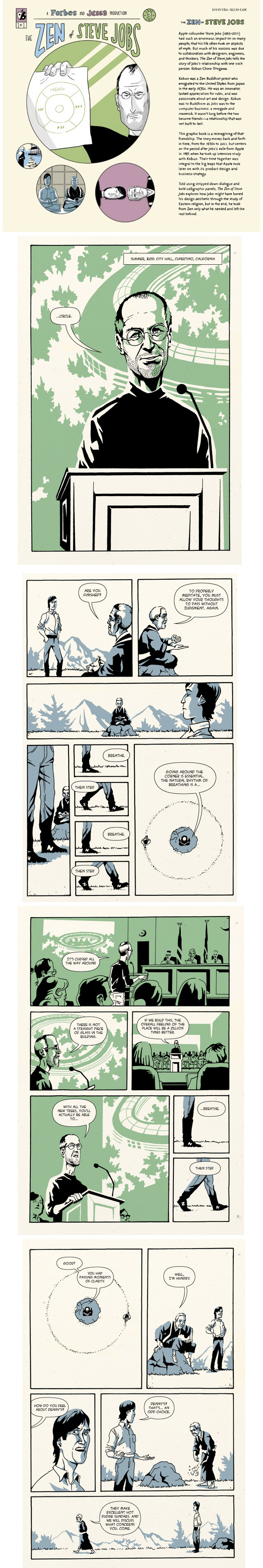C’est une exclusivité du magazine économique américain Forbes, voici quelques pages du prochain roman graphique, The Zen Of Steve Jobs. Écrit par JESS3, il raconte la vie de Steve Jobs avec son ami et mentor, Kobun Chino Otogawa, un prêtre Japonais bouddhiste zen. Leur rencontre a lieu au milieu des années 1980, après le départ de Steve Jobs d’Apple et la fondation de NeXT – qui sera rachetée plus tard par Apple. Le récit est ainsi ponctué par les autres points forts de la carrière de Steve Jobs et explore l’empreinte de la méditation japonaise sur sa vie et sa carrière. Ce thème sera donc central tout au long du livre et offrira une vision quelque peu nouvelle de la vie de Steve Jobs.