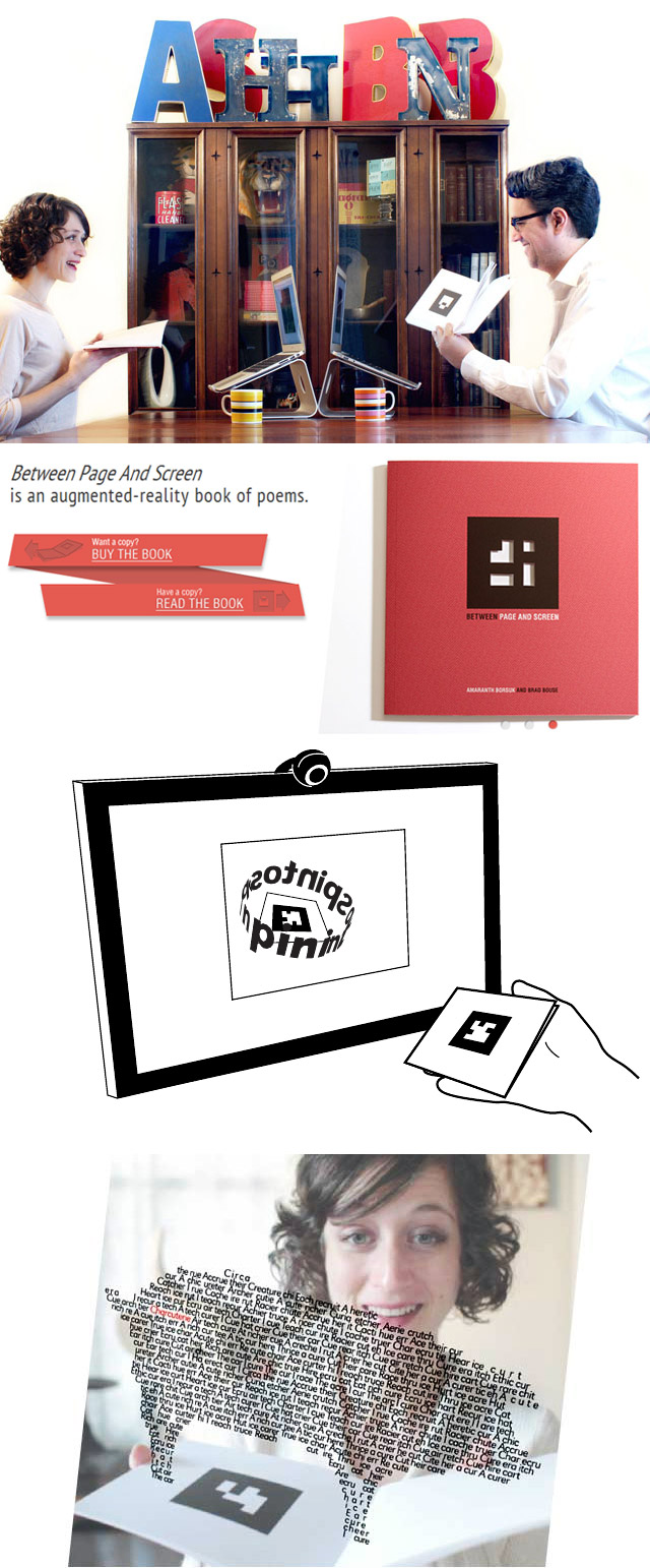 Entre la page et l’écran (Between Page And Screen de son titre en anglais) est un livre utilisant la réalité augmentée pour créer des poèmes typographiques. Ainsi, ce livre se présente comme un livre pop-up numérique dans lequel vous pouvez tenir littéralement les mots entre vos mains. Avec votre ordinateur, vous allez pouvoir jouer et découvrir ce livre entre la page et l’écran : vous n’avez besoin que d’une webcam. Il vous suffit d’imprimer un marqueur téléchargé sur le site de Between Page And Screen, d’allumer votre webcam et de lui montrer votre livre. Écrit par Borsuk Amaranth et programmé par Brad Bouse, ces poèmes sont composés d’une série de lettres échangées entre deux amants, P et S. Au travers de ces lettres, ils tentent de définir la relation qui les unis et des animations typographiques viennent donner vie à leur histoire.