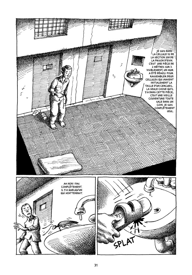 Le témoignage de première main d’un ancien prisonnier est rare. Les images de l’intérieur de la prison n’existent pas. Dans son album, Mana Neyestani dessine sa cellule, ses co-détenus, sans tabous. Il raconte la condition des Afghans entassés dans des cellules, les drogués en crise de manque spoliés et manipulés par des escrocs peu scrupuleux, les défenseurs des droits humains un peu trop zélés aux yeux du gouvernement.