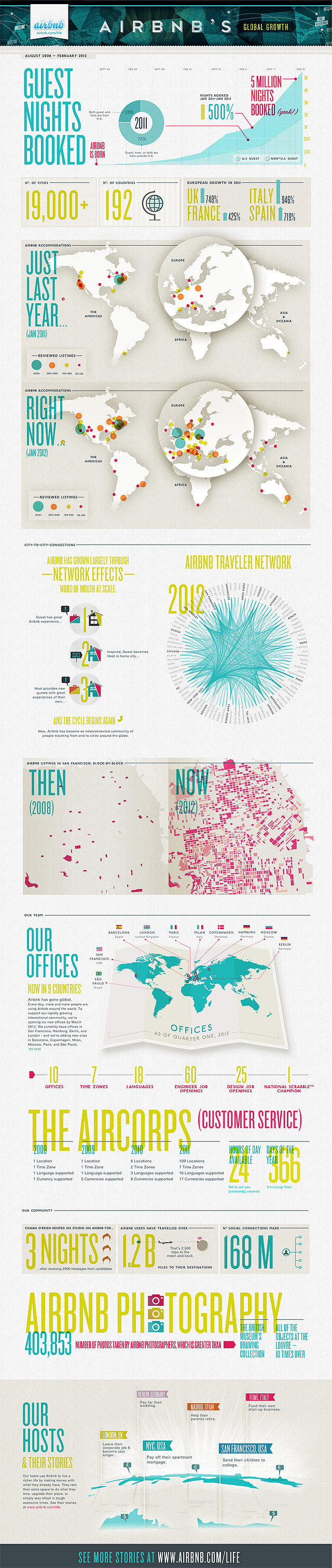 C’est LA dataviz’ de la semaine, il s’agit du site Airbnb,  qui publié une datavisualisation très belle et très intéressante sur la croissance mondiale d’Airbnb, en partageant leurs propres statistiques au sujet de leur croissance de août 2008 à février 2012.  La site Airbnb a commencé à San Francisco et avait pour but e centraliser les annonces de particuliers désireux de louer une habitation à des voyageurs. Aujourd’hui, plus de cinq millions de nuitées ont été réservées sur Airbnb et même si les racines de Airbnb sont aux Etats-Unis, plus de 75% de toutes ces nuitées se sont faites à l’international.
