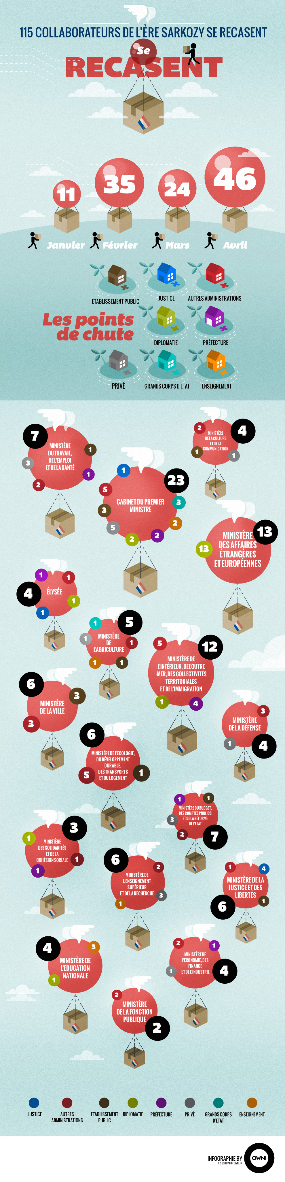 L'infographie des amis que l'on remercie: regardez comment le gouvernement et l'Élysée ont recasé leurs loyaux serviteurs. Dans les semaines qui ont précédé ce second tour, entre le 1er janvier et le 1er mai, 115 conseillers, directeurs de cabinets et collaborateurs des ministres et du chef de l'État ont été promus à des emplois plus stables. OWNI a compilé ces mouvements de personnels très politiques en une image globale. Ils sont tous là.