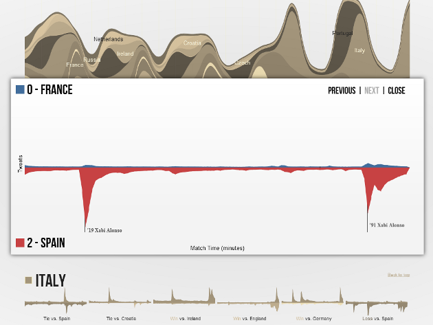 Deuxième bel ouvrage, pondu par Nicolas Belmonte, est celui matérialisé à l’occasion de la fin de l’Euro de football : le “streamgraph” #Euro2012 montre “simplement” le nombre de tweets échangés durant la compétition en introduisant le paramètre lexical dans son analyse. Le plus intéressant ici est bien sûr que le dispositif capte quelle équipe est mentionnée pour chaque match et à quel moment du match ces mentions se produisent. À défaut d’être très joli, au moins c’est clair.