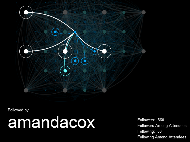 La première performance a été réalisée par Jeff Johnston. Son défi : représenter graphiquement les liens [en] qui unissent via Twitter les participants du festival Eyeo et mettre en couleurs l’évolution de ces relations à la suite de la manifestation. À défaut d’être très clair, au moins c’est joli.