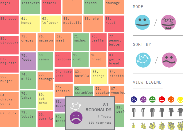 Cette seconde application, “FoodMood” est plus ambivalente. Intéressante au niveau du concept, la réalisation laisse un peu à désirer en termes d’ergonomie et de navigation. Ce projet a pour ambition de connaître puis représenter les liens entre nourriture et émotions. Quelle émotion (joie, satisfaction, dégoût…) nous apporte un hamburger ou une tarte à la fraise ? Ce sentiment est-il le même dans un autre pays voisin ? Pour construire ces données, Affect Lab (une équipe pluridisciplinaire de chercheurs, designers et informaticiens à l’origine de ce projet) a choisi de scraper l’ensemble des tweets faisant référence à la nourriture et, en se basant sur les recherches de l’Université de Stanford, d’appliquer des “émotions” sur ces tweets.