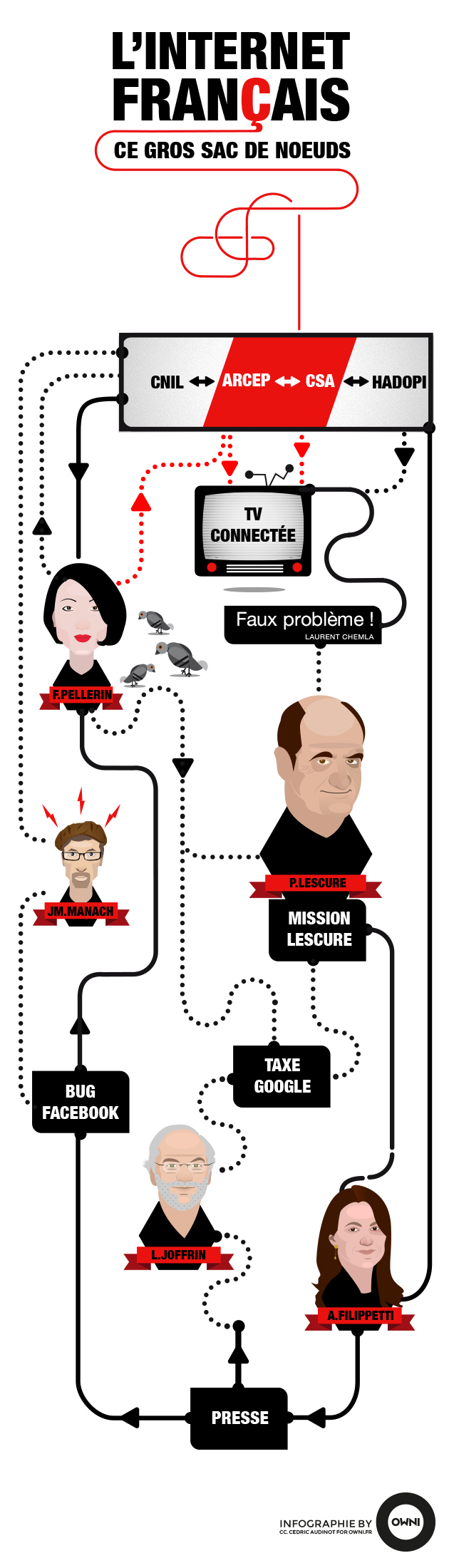 L'Internet français entre Monty Python et Plus Belle la Vie. Bug Facebook, pigeons, Lescure, guerres de chapelles, Cnil, Hadopi, CSA, Arcep, on ne sait plus qui fusionne avec qui. Mais on sait déjà qui paiera les pots cassés. On a fait une infographie pour en rigoler. Ça vaut mieux.